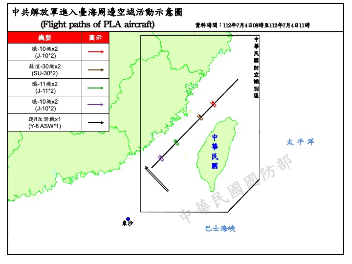 國防部表示,自今(4)日8時許,陸續偵獲中共殲-10、殲-11、殲-16、蘇愷-30、轟-6、運-8反潛機等各型機計24架次出海活動,其中逾越海峽中線及其延伸線進入西南空域9架次;另共艦4艘配合執行聯合戰備警巡。國軍運用聯合情監偵手段,全程掌握共軍動態,並檢派任務機、艦及岸置飛彈系統,嚴密監控應處。