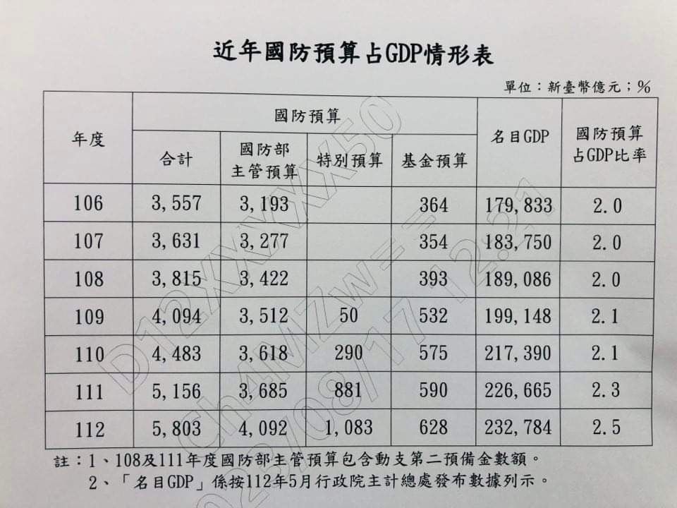 針對媒體報導「國防預算直到112年度才突破國內生產毛額(GDP)2%」,國防部今(17)日指出,我國國防預算除國防部主管預算外,尚包含特別預算及基金預算,近年國防預算規模自106年3,557億元,至112年5,803億元,累計增加2,246億元,增幅63%;占GDP比率則自106年2.0%,已逐年成長至112年2.5%。