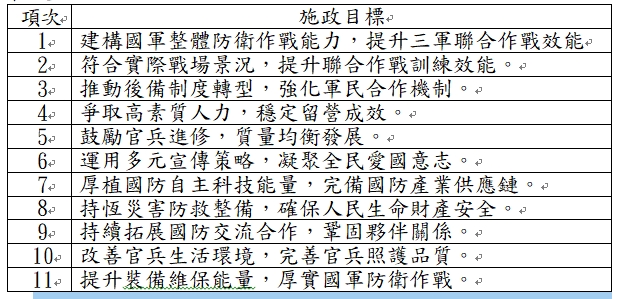 國防部113年度施政計畫所列「施政目標」計有「建構國軍整體防衛作戰能力,提升三軍聯合作戰效能」、「符合實際戰場景況,提升聯合作戰訓練效能」等11項(如下表),由各單位共同負責推動工作,並於年度結束後,檢視施政效能。