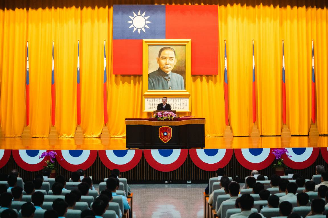 顧部長上午在副部長柏鴻輝、三軍司令及相關聯參的陪同下,勗勉在陸軍官校接受愛國教育的全體新科軍官。
