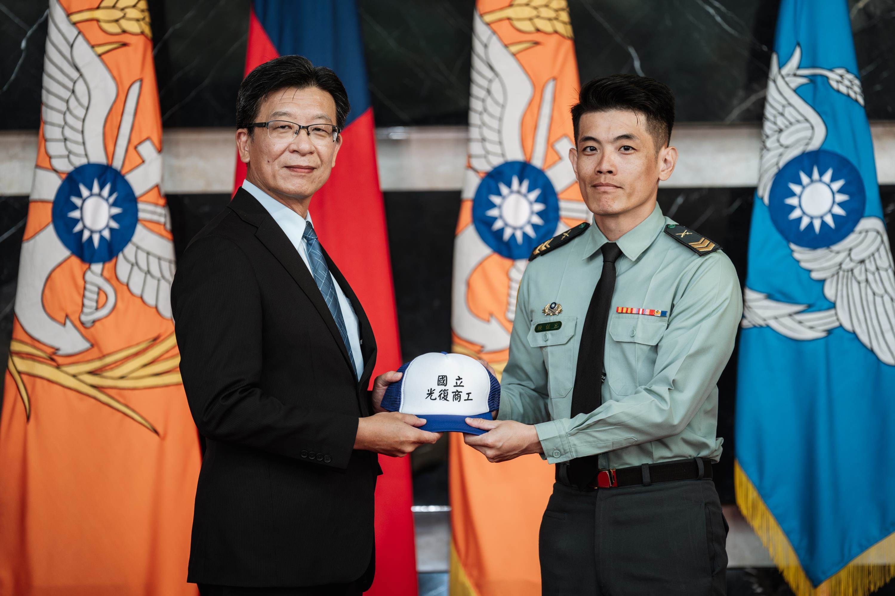 花蓮光復商工校長陳德明先生回贈陸軍第十軍團士官長陳保宏帽子,象徵傳遞感謝。