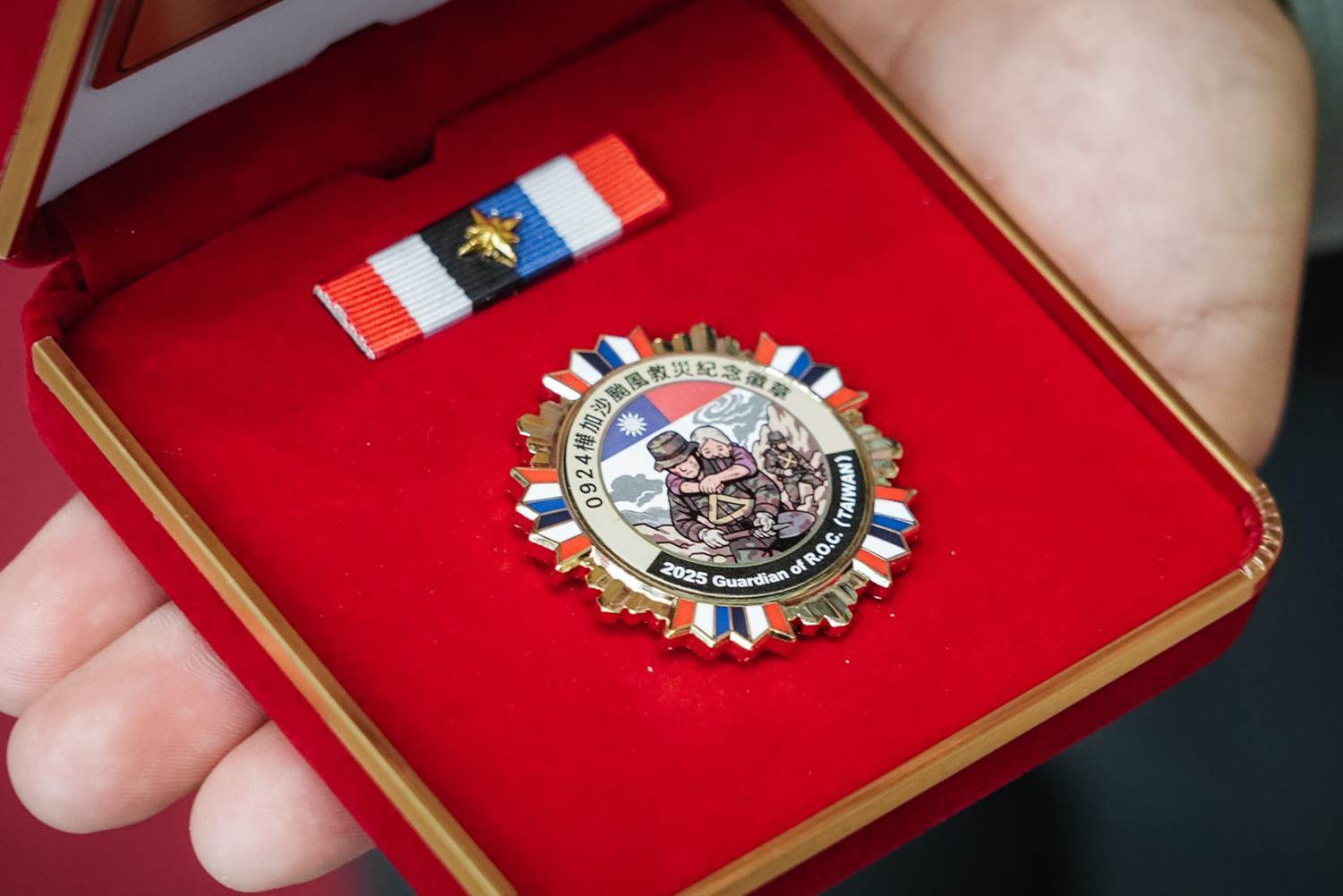 為表彰救災官兵在崗位上克盡職責,給予國人全方面的守護,顧部長親自為101位救災官兵代表頒發「0924樺加沙颱風國軍救災紀念章」。此次紀念章以圓形徽章為主體,中央刻劃軍人背負受災民眾、全力搶救的身影,搭配颱風渦旋與群山背